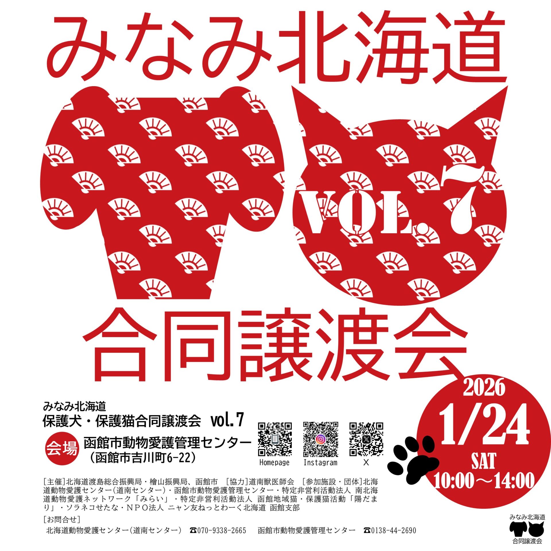 HOME猫を助ける名前もないまま亡くなる猫をなくすために‥寄付をして助けるニャン友のサポーターになる。継続的にニャン友の活動を応援したい方へ募金はこちらから 猫を助ける名前もないまま亡くなる猫をなくすために‥寄付をして助けるニャン友のサポーターになる。継続的にニャン友の活動を応援したい方へ募金はこちらから 保護猫をお迎えしたいあなたへ 保護猫をお迎えしたいあなたへ 猫を助ける 猫を助ける 関連リンク 関連リンク Youtube Youtube 保険情報 保険情報 アニコム損害保険株式会社 お申し込みはこちら SBIプリズム少額短期保険株式会社 お申し込みはこちら SNS情報 SNS情報Instagram nyantomo_network 2026年、はじまりましたねー! 新年早 2026年最初の日曜日。 明日から仕事は ★DMは解放しておりません。お問い合 ハッピーニャーイヤー🐱 新しい年 ★DMは解放しておりません。お問い合 ★DMは解放しておりません。お問い合 ★DMは解放しておりません。お問い合 さらに読み込む... Instagram でフォロー nyantomo_network 2026年、はじまりましたねー! 新年早 2026年最初の日曜日。 明日から仕事は ★DMは解放しておりません。お問い合 ハッピーニャーイヤー🐱 新しい年 ★DMは解放しておりません。お問い合 ★DMは解放しておりません。お問い合 ★DMは解放しておりません。お問い合 さらに読み込む... Instagram でフォロー Facebook Twitter 里親募集 里親募集募集状況里親募集中里親募集中名前手稲 ジュジュ 年齢約3ヵ月 性別メス 詳細を見る 里親募集中里親募集中名前手稲 ビビ 年齢約3ヵ月 性別メス 詳細を見る 里親募集中里親募集中名前アゲル トリュフ 年齢約6ヵ月 性別オス 詳細を見る 里親募集中里親募集中名前伊達 チェリー 年齢約1歳6ヵ月 性別オス 詳細を見る 里親募集中里親募集中名前北見 いづみ 年齢約2ヵ月 性別オス 詳細を見る 里親募集中里親募集中函館市愛護センター名前函館 しょうこ 年齢約3ヵ月 性別メス 詳細を見る 里親募集中里親募集中函館市愛護センター名前函館 あおと 年齢約3ヵ月 性別オス 詳細を見る 里親募集中里親募集中名前北見 ちえみ 年齢約2ヵ月 性別メス 詳細を見る 里親募集中里親募集中名前北見 ひばり 年齢約2ヵ月 性別メス 詳細を見る 里親募集中里親募集中名前北斗 ムニ 年齢約5ヵ月 性別オス 詳細を見る 里親募集中里親募集中名前北斗 ユイツ 年齢約5ヵ月 性別メス 詳細を見る 里親募集中里親募集中名前北斗 イチエ 年齢約5ヵ月 性別メス 詳細を見る 里親募集中里親募集中名前港町 チロ 年齢約6ヵ月 性別メス 詳細を見る 里親募集中里親募集中名前函館山の手 コウ 年齢約3歳 性別オス 詳細を見る 里親募集中里親募集中名前北見 黒たん 年齢約8ヵ月 性別オス 詳細を見る ニャン友Blog ニャン友blog NEW! 【01/24】みなみ北海道 保護犬・保護猫合同譲渡会 vol.7[函館市][ニャン友ねっとわーく北海道] 2026/01/04 18:01 北海道動物愛護センター(道南センター)・函館市動物愛護管理センターからイベント開催のお知らせです。 渡島総合振興局・檜山振興局・函館市は、… ご支援のお礼。今年も1年お世話になりありがとうございました。[ニャン友ねっとわーく北海道] 2025/12/31 09:39 いつもニャン友ねっとわーく北海道の活動にご理解・ご協力・ご支援いただきましてありがとうございます。 2025年ももう終わり。 今年も… 【01/11-12】ジョイフルAK保護猫の譲渡会[札幌市][ニャン友ねっとわーく北海道] 2025/12/30 16:56 今年もあと2日になりました。 12月は各保健所等からの受け入れがおおくなるのを見越して毎週土日譲渡会を開催してきました。 沢山の猫たちに新しい家族が… 【12/27-28】ニャン友キャットラウンジ保護猫の譲渡会[札幌市][ニャン友ねっとわーく北海道] 2025/12/21 17:17 ついに今年も残りわずか。 一般職は仕事納めが近づいてきました。 今年中にお声かかるかしら…と猫たちがそわそわしております。 お… 今年最後の多頭飼育崩壊からの受け入れ[ニャン友ねっとわーく北海道] 2025/12/18 08:24 いつもニャン友ねっとわーく北海道の活動にご賛同いただきありがとうございます。 道南より多頭飼育崩壊及び虐待の案件の相談がありました。 … 【12/21,12/27-28】ニャン友キャットラウンジ保護猫の譲渡会[札幌市][ニャン友ねっとわーく北海道] 2025/12/16 18:37 いよいよ今年も終わりが近づいてきました。 年末年始のお休みの時に、新しい家族と過ごしませんか? 今の時期は小さい子猫が少ないですが、落ち… 【12/13-14】ニャン友キャットラウンジ保護猫の譲渡会[札幌市][ニャン友ねっとわーく北海道] 2025/12/10 10:26 例年譲渡率が下がる年末ですが、頑張って譲渡会開催します! 子猫もまだまだいますし、大人猫も絶賛募集中。 最近は保護されてから長くなっ… ご支援のお礼と先日の黒猫さんのご報告[ニャン友ねっとわーく北海道] 2025/12/09 20:05 いつもニャン友ねっとわーく北海道の活動にご理解・ご協力・ご支援いただきましてありがとうございます。 先日緊急保護したのに残念ながら助け… 【12/13-14】保護猫の譲渡会in