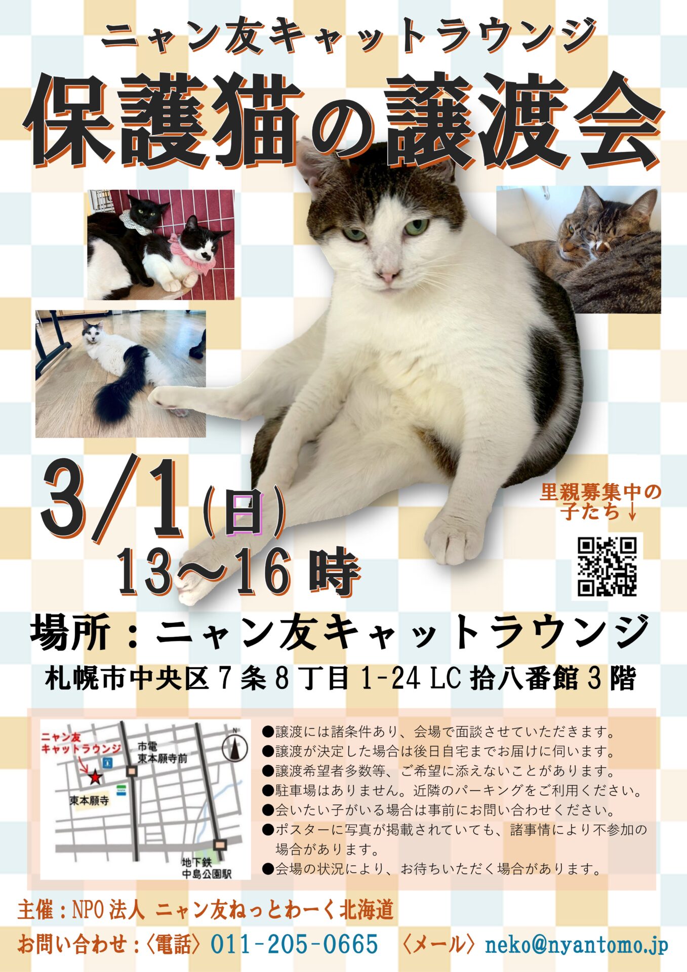 HOME猫を助ける名前もないまま亡くなる猫をなくすために‥寄付をして助けるニャン友のサポーターになる。継続的にニャン友の活動を応援したい方へ募金はこちらから 猫を助ける名前もないまま亡くなる猫をなくすために‥寄付をして助けるニャン友のサポーターになる。継続的にニャン友の活動を応援したい方へ募金はこちらから 保護猫をお迎えしたいあなたへ 保護猫をお迎えしたいあなたへ 猫を助ける 猫を助ける 関連リンク 関連リンク Youtube Youtube 保険情報 保険情報 アニコム損害保険株式会社 お申し込みはこちら SBIプリズム少額短期保険株式会社 お申し込みはこちら SNS情報 SNS情報Instagram nyantomo_network ★DMは解放しておりません。お問い合 ★DMは解放しておりません。お問い合 ★DMは解放しておりません。お問い合 ★DMは解放しておりません。お問い合 ★DMは解放しておりません。お問い合 さらに読み込む... Instagram でフォロー nyantomo_network ★DMは解放しておりません。お問い合 ★DMは解放しておりません。お問い合 ★DMは解放しておりません。お問い合 ★DMは解放しておりません。お問い合 ★DMは解放しておりません。お問い合 さらに読み込む... Instagram でフォロー Facebook Twitter 里親募集 里親募集募集状況里親募集中里親募集中名前留寿都 みつば 年齢約9ヵ月 性別オス 詳細を見る 里親募集中里親募集中名前留寿都 すいか 年齢約9ヵ月 性別オス 詳細を見る 里親募集中里親募集中名前伊達 パソラ 年齢約6ヵ月 性別メス 詳細を見る 里親募集中里親募集中名前きたひろ アール 年齢約2歳 性別メス 詳細を見る 里親募集中里親募集中函館市愛護センター名前函館 かすてら 年齢約1歳9ヵ月 性別メス 詳細を見る 里親募集中里親募集中函館市愛護センター名前函館 ねぎま 年齢約3歳6ヵ月 性別オス 詳細を見る 里親募集中里親募集中名前大岸 テン 年齢約10ヵ月 性別オス 詳細を見る 里親募集中里親募集中名前大岸 クウ 年齢約10ヵ月 性別オス 詳細を見る 里親募集中里親募集中名前稀府 プリフ 年齢約7ヵ月 性別メス 詳細を見る 里親募集中里親募集中名前稀府 タウン 年齢約8ヵ月 性別メス 詳細を見る 里親募集中里親募集中名前田中 カイ 年齢約8ヵ月 性別オス 詳細を見る 里親募集中里親募集中名前田中 メイ 年齢約8ヵ月 性別メス 詳細を見る 里親募集中里親募集中名前田中 テン 年齢約8ヵ月 性別オス 詳細を見る 里親募集中里親募集中名前当別 エリカ 年齢約1歳9ヵ月 性別メス 詳細を見る 里親募集中里親募集中名前乾 ちぇり 年齢約8ヵ月 性別メス 詳細を見る ニャン友Blog ニャン友blog NEW! 【03/01】ニャン友キャットラウンジ保護猫の譲渡会[札幌市][ニャン友ねっとわーく北海道] 2026/02/25 19:12 気が付けばもう1か月ちょっとで4月。 春になればまた子猫シーズンが始まります。 今年こそ保護依頼が減ればな…と思いながらも、毎年大忙しの季… 【03/07-03/08】保護猫の譲渡会in伊達市[伊達市][ニャン友ねっとわーく北海道] 2026/02/20 11:25 皆様、いつもニャン友ねっとわーくの活動に、ご賛同頂きありがとうございます。 譲渡会での皆様の暖かいご声援、ご寄付、物販のお買い上げ、本当に… 【02/21-02/22】ニャン友キャットラウンジ保護猫の譲渡会[札幌市][ニャン友ねっとわーく北海道] 2026/02/17 19:14 真冬日も減り冬から抜け出しつつあります。 しかし、気温はプラスですが、2月前後は仕事の転職や移動などがあるせいか譲渡率が著しく下がる時期。 … 【02/28】みなみ北海道動物愛護教室 VOL.4[函館市][ニャン友ねっとわーく北海道] 2026/02/12 19:49 こんにちは!北海道動物愛護センター(道南センター)・函館市動物愛護管理センターからイベント開催のお知らせです。 令和8年2月28日(土)の13時… 【02/14-15】保護猫の譲渡会 ジョイフルエーケー大麻店[江別市][ニャン友ねっとわーく北海道] 2026/02/07 11:26 大雪により、毎日夜遅くまで除排雪で尽力されている方々に感謝いたします。 と、同時に「もう、雪はいらない」の本音も出る道民…。 まだまだ来… 【02/14-15】保護猫の譲渡会in苫小牧市[苫小牧市][ニャン友ねっとわーく北海道] 2026/02/02 14:59 2026年がスタートして1ヶ月が経ちました。 北海道は立春とは名ばかりの冷え込む朝が続きますが、雪の下で力を蓄え、春を待つ草花の芽吹きが楽しみ… 【01/31-02/01】ニャン友キャットラウンジ保護猫の譲渡会[札幌市][ニャン友ねっとわーく北海道] 2026/01/29 07:48 先週末の譲渡会は大雪で来場がイマイチでしたが、頑張って来てくれて決まった子がおりました。 ありがたいです。 来れなかったみなさまのために… 【01/31-02/01】保護猫の譲渡会in伊達市[伊達市][ニャン友ねっとわーく北海道] 2026/01/28 19:46 いつも活動にご理解ご協力ありがとうございます。 家族へご縁を繋ぐ為、室蘭支部も定期的に譲渡会を開催しております。 ひとえに会場をお貸し頂… わんこに助けられた、ちいちゃん手術を終えてわかったこと[ニャン友ねっとわーく北海道] 2026/01/28 08:03 前回のお話:https://nyantomo55.blog.fc2.com/blog-entry-2698.html 無事手