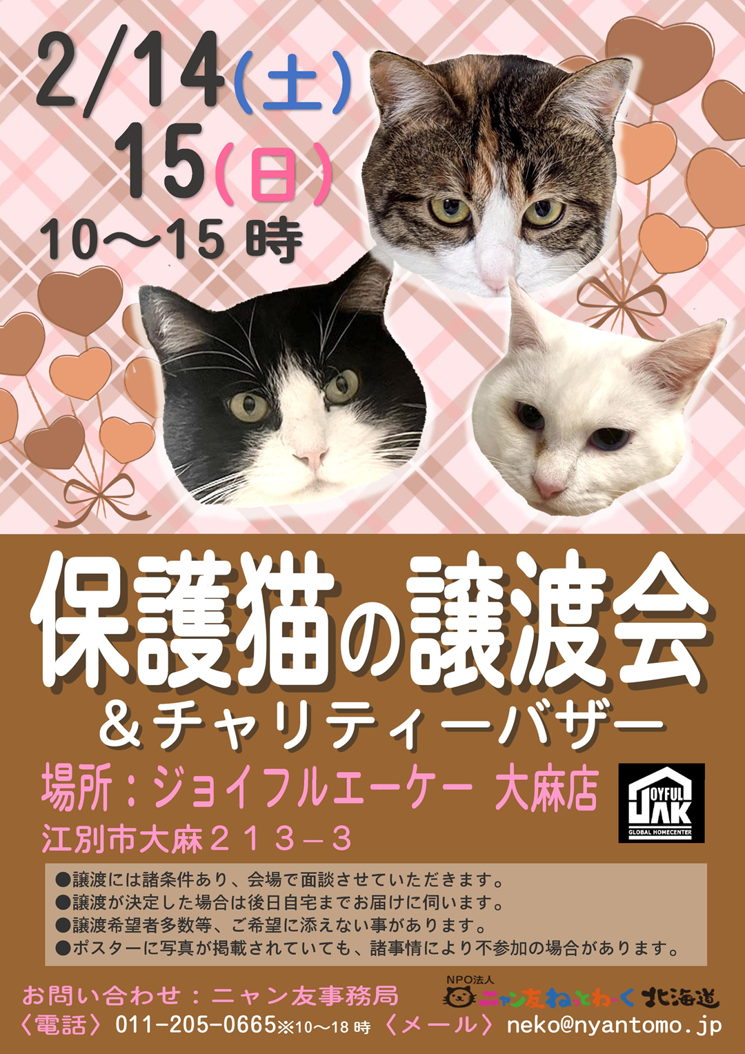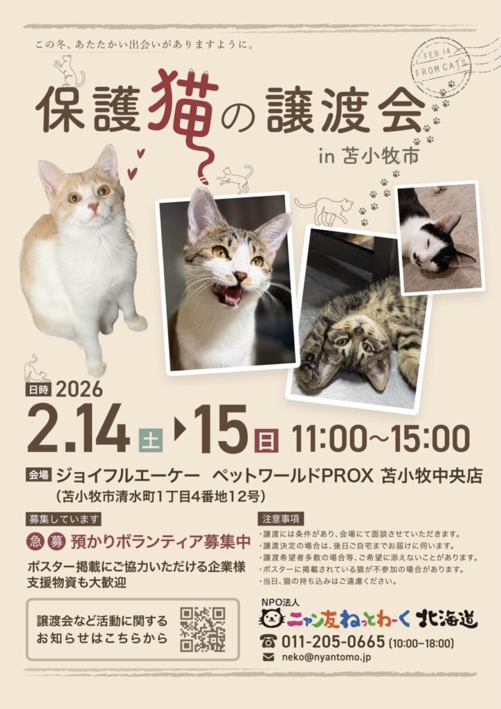 HOME猫を助ける名前もないまま亡くなる猫をなくすために‥寄付をして助けるニャン友のサポーターになる。継続的にニャン友の活動を応援したい方へ募金はこちらから 猫を助ける名前もないまま亡くなる猫をなくすために‥寄付をして助けるニャン友のサポーターになる。継続的にニャン友の活動を応援したい方へ募金はこちらから 保護猫をお迎えしたいあなたへ 保護猫をお迎えしたいあなたへ 猫を助ける 猫を助ける 関連リンク 関連リンク Youtube Youtube 保険情報 保険情報 アニコム損害保険株式会社 お申し込みはこちら SBIプリズム少額短期保険株式会社 お申し込みはこちら SNS情報 SNS情報Instagram nyantomo_network ★DMは解放しておりません。お問い合 ★DMは解放しておりません。お問い合 ★DMは解放しておりません。お問い合 ★DMは解放しておりません。お問い合 さらに読み込む... Instagram でフォロー nyantomo_network ★DMは解放しておりません。お問い合 ★DMは解放しておりません。お問い合 ★DMは解放しておりません。お問い合 ★DMは解放しておりません。お問い合 さらに読み込む... Instagram でフォロー Facebook Twitter 里親募集 里親募集募集状況里親募集中里親募集中名前函館 3エビ 年齢約4歳9ヵ月 性別メス 詳細を見る 里親募集中里親募集中名前稀府 タウン 年齢約7ヵ月 性別メス 詳細を見る 里親募集中里親募集中名前レガ レイラ 年齢約3ヵ月 性別メス 詳細を見る 里親募集中里親募集中名前函館 ソルト 年齢約1歳3ヵ月 性別オス 詳細を見る 里親募集中里親募集中名前末永 なつめ 年齢約1歳6ヵ月 性別メス 詳細を見る 里親募集中里親募集中道南愛護センター名前道南 みけ 年齢約6歳 性別メス 詳細を見る 里親募集中里親募集中函館市愛護センター名前道南 しろ 年齢約6歳 性別オス 詳細を見る 里親募集中里親募集中名前函館山の手 コウ 年齢約3歳 性別オス 詳細を見る 里親募集中里親募集中名前大岸 クウ 年齢約9ヵ月 性別オス 詳細を見る 里親募集中里親募集中名前大岸 テン 年齢約9ヵ月 性別オス 詳細を見る 里親募集中里親募集中名前室蘭 チップ 年齢約4ヵ月 性別オス 詳細を見る 里親募集中里親募集中名前室蘭 デール 年齢約4ヵ月 性別オス 詳細を見る 里親募集中里親募集中名前手稲 ビビ 年齢約4ヵ月 性別メス 詳細を見る 里親募集中里親募集中道南愛護センター名前道南 ノエル 年齢約3ヵ月 性別オス 詳細を見る 里親募集中里親募集中名前東区 ジャッジ 年齢約11ヵ月 性別オス 詳細を見る ニャン友Blog ニャン友blog 【02/14-15】保護猫の譲渡会in苫小牧市[苫小牧市][ニャン友ねっとわーく北海道] 2026/02/02 14:59 2026年がスタートして1ヶ月が経ちました。 北海道は立春とは名ばかりの冷え込む朝が続きますが、雪の下で力を蓄え、春を待つ草花の芽吹きが楽しみ… 【01/31-02/01】ニャン友キャットラウンジ保護猫の譲渡会[札幌市][ニャン友ねっとわーく北海道] 2026/01/29 07:48 先週末の譲渡会は大雪で来場がイマイチでしたが、頑張って来てくれて決まった子がおりました。 ありがたいです。 来れなかったみなさまのために… 【01/31-02/01】保護猫の譲渡会in伊達市[伊達市][ニャン友ねっとわーく北海道] 2026/01/28 19:46 いつも活動にご理解ご協力ありがとうございます。 家族へご縁を繋ぐ為、室蘭支部も定期的に譲渡会を開催しております。 ひとえに会場をお貸し頂… わんこに助けられた、ちいちゃん手術を終えてわかったこと[ニャン友ねっとわーく北海道] 2026/01/28 08:03 前回のお話:https://nyantomo55.blog.fc2.com/blog-entry-2698.html 無事手術を終えたちいちゃん抜糸をしてきました。 ばらば… 【01/25】ニャン友キャットラウンジ保護猫の譲渡会[札幌市][ニャン友ねっとわーく北海道] 2026/01/23 21:59 バタバタしているうちに早くも1月下旬。 遅ばせながら今年初のラウンジ譲渡会となります。 嬉しいことに年末年始で出発した子も多く、シェ… わんこに助けられた猫、千尋(ちいちゃん)の緊急手術[ニャン友ねっとわーく北海道] 2026/01/17 00:11 1月7日、1匹の大けがをおった猫が当会に運び込まれました。 両足が折れて動くことも出来ません。 お話を聞くと 12月30日 夕方わんこの散歩中に急… 【01/18】保護猫の譲渡会in室蘭市[室蘭市][ニャン友ねっとわーく北海道] 2026/01/13 11:25 2025年も沢山の温かいご支援をありがとうございました。 命をつなぐリレーにご理解とご協力頂き、心から御礼申し上げます。 始まりました2026年が動物た… 【01/24】みなみ北海道 保護犬・保護猫合同譲渡会 vol.7[函館市][ニャン友ねっとわーく北海道] 2026/01/04 18:01 北海道動物愛護センター(道南センター)・函館市動物愛護管理センターからイベント開催のお知らせです。 渡島総合振興局・檜山振興局・函館市は、… ご支援のお礼。今年も1年お世話になりありがとうございました。[ニャン友ねっとわーく北海道] 2025/12/31 09:39 いつもニャン友ねっとわーく北海道の活動にご理解・ご協力・ご支援いただきましてありがとうございます。 2025年ももう終わり。 今年も… 【01/11-12】ジョイフルAK保護