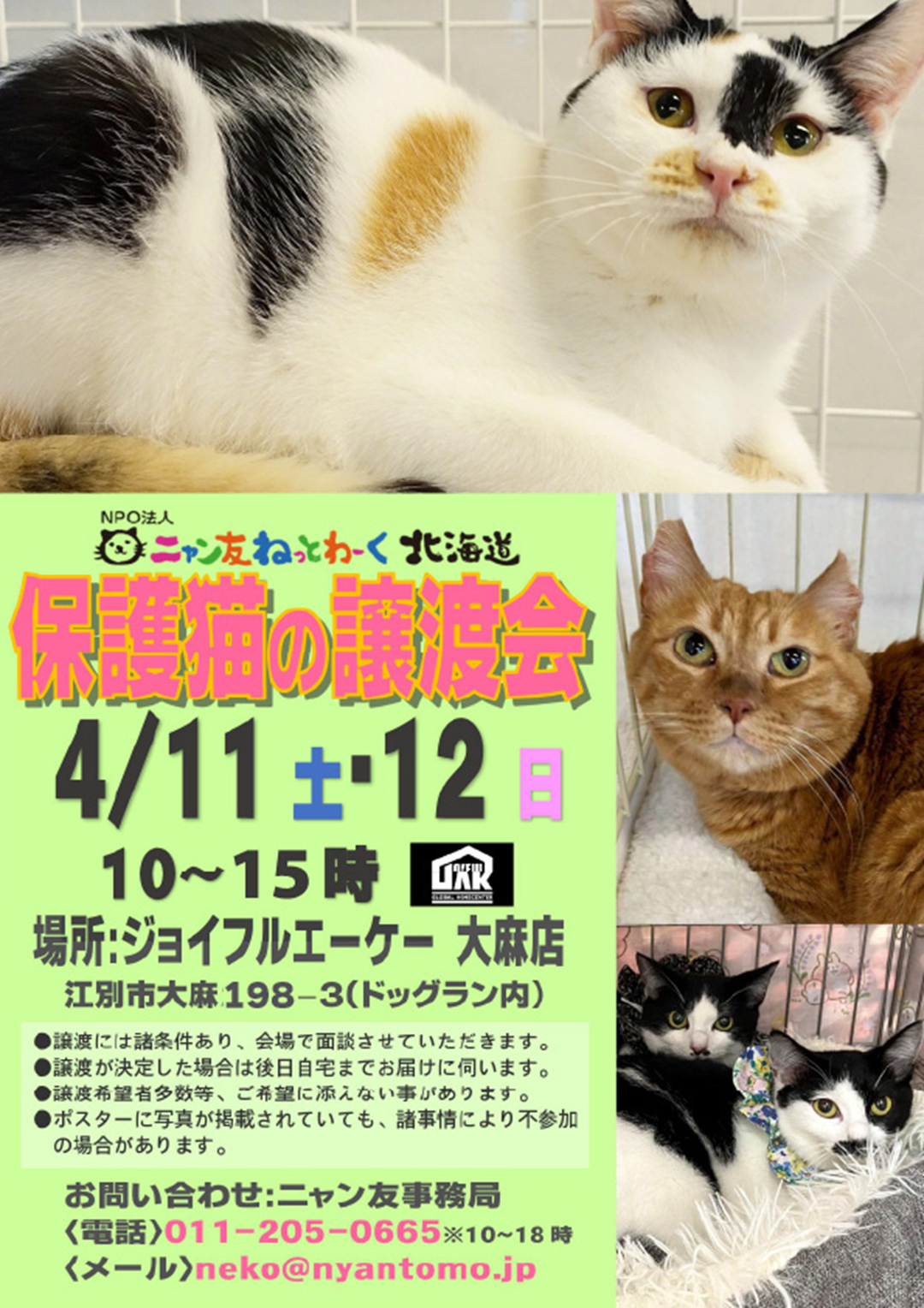 HOME猫を助ける名前もないまま亡くなる猫をなくすために‥寄付をして助けるニャン友のサポーターになる。継続的にニャン友の活動を応援したい方へ募金はこちらから 猫を助ける名前もないまま亡くなる猫をなくすために‥寄付をして助けるニャン友のサポーターになる。継続的にニャン友の活動を応援したい方へ募金はこちらから 保護猫をお迎えしたいあなたへ 保護猫をお迎えしたいあなたへ 猫を助ける 猫を助ける 関連リンク 関連リンク Youtube Youtube 保険情報 保険情報 アニコム損害保険株式会社 お申し込みはこちら SBIプリズム少額短期保険株式会社 お申し込みはこちら SNS情報 SNS情報Instagram nyantomo_network ★DMは解放しておりません。お問い合 ★DMは解放しておりません。お問い合 ★DMは解放しておりません。お問い合 “むっぎでーーす! へっへーん! だ ★DMは解放しておりません。お問い合 さらに読み込む... Instagram でフォロー nyantomo_network ★DMは解放しておりません。お問い合 ★DMは解放しておりません。お問い合 ★DMは解放しておりません。お問い合 “むっぎでーーす! へっへーん! だ ★DMは解放しておりません。お問い合 さらに読み込む... Instagram でフォロー Facebook Twitter 里親募集 里親募集募集状況里親募集中里親募集中名前乾 ちぇり 年齢約9ヵ月 性別メス 詳細を見る 里親募集中里親募集中名前きたひろ アール 年齢約2歳 性別メス 詳細を見る 里親募集中里親募集中名前竹原 むぎ 年齢約6ヵ月 性別オス 詳細を見る 里親募集中里親募集中名前長谷川 黒美母さん 年齢約2歳9ヵ月 性別メス 詳細を見る 里親募集中里親募集中名前長谷川 ホワイティ 年齢約10ヵ月 性別メス 詳細を見る 里親募集中里親募集中名前江別 りゅう 年齢約8ヵ月 性別オス 詳細を見る 里親募集中里親募集中名前江別 ミラノ 年齢約1歳9ヵ月 性別メス 詳細を見る 里親募集中里親募集中名前松井 こはく 年齢約1歳 性別メス 詳細を見る 里親募集中里親募集中名前伊達 パソラ 年齢約7ヵ月 性別メス 詳細を見る 里親募集中里親募集中函館市愛護センター名前函館 かすてら 年齢約1歳9ヵ月 性別メス 詳細を見る 里親募集中里親募集中函館市愛護センター名前函館 ねぎま 年齢約3歳6ヵ月 性別オス 詳細を見る 里親募集中里親募集中名前大岸 テン 年齢約11ヵ月 性別オス 詳細を見る 里親募集中里親募集中名前大岸 クウ 年齢約11ヵ月 性別オス 詳細を見る 里親募集中里親募集中名前稀府 プリフ 年齢約8ヵ月 性別メス 詳細を見る 里親募集中里親募集中名前稀府 タウン 年齢約9ヵ月 性別メス 詳細を見る ニャン友Blog ニャン友blog NEW! 【04/11-12】保護猫の譲渡会 ジョイフルエーケー 大麻店[江別市][ニャン友ねっとわーく北海道] 2026/03/28 12:53 あれよあれよと、3月も後半となりました。 北海道にも春の便りが来始めていますね。 4月もジョイフルエーケー大麻店(江別市大麻198−3)さ… 【04/02-04】保護猫、保護犬のためのチャリティバザー in チカホ[札幌市][ニャン友ねっとわーく北海道] 2026/03/21 16:46 今年も、昨年のように春が速足で近づいてきていますね。 雪も解けて、お外を歩くのも楽しい季節がやって参りました。 ですが、来る4月2… 【04/18-19】保護猫の譲渡会in苫小牧市[苫小牧市][ニャン友ねっとわーく北海道] 2026/03/20 23:49 春の便りが各地から届く季節となりました。 季節の移ろいと共に新生活が始まる方、希望に満ち溢れ幸せの花が咲く様にと願わずにはいられません。 … 【奥尻TNR事業】奥尻島にきています[ニャン友ねっとわーく北海道] 2026/03/20 00:44 昨年春に相談のあった奥尻島の100以上の未去勢未避妊の猫たちの避妊去勢手術の依頼ですが、昨年5月初旬に島に入ると島全体で猫が20匹しか見当た… 【04/02-04】保護猫、保護犬のためのチャリティバザー in チカホ[札幌市][ニャン友ねっとわーく北海道] 2026/03/17 12:40 今年も、昨年のように春が速足で近づいてきていますね。 雪も解けて、お外を歩くのも楽しい季節がやって参りました。 ですが、来る4月2日(… 【03/29】保護猫の譲渡会in伊達[伊達市][ニャン友ねっとわーく北海道] 2026/03/13 19:23 皆さま、こんにちは。 先日の三ッ和会館の譲渡会では、天候が悪い中、足を運んで下さって、ありがとうございます。 沢山の御寄付、支援物資も頂… 【03/28】みなみ北海道動保護犬・保護猫合同譲渡会 vol.8[函館市][ニャン友ねっとわーく北海道] 2026/03/12 08:53 こんにちは!北海道動物愛護センター(道南センター)・函館市動物愛護管理センターからイベント開催のお知らせです。 渡島総合振興局・檜山振興局… 【03/20-21】ニャン友キャットラウンジ保護猫の譲渡会[札幌市][ニャン友ねっとわーく北海道] 2026/03/11 10:05 雪解けも進み、春の足音が聞こえてきました。 新しい季節、猫と一緒にスタートしませんか? 春になればまた子猫シーズンが始まります。 … 【03/15】ニャン友ねっとわーく北海道函館支部 保護猫の譲渡会in函館[函館市][ニャン友ねっとわーく北海道] 2026/03/09 10:04 春風が心地よく、春の訪れを感じる季節になりまし