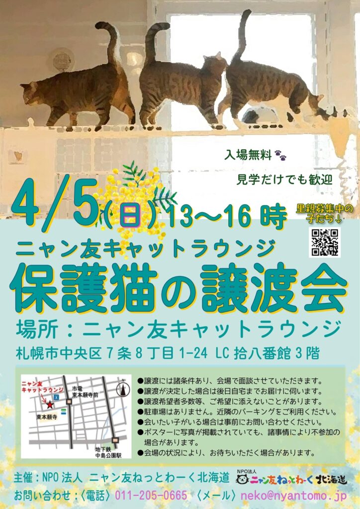 HOME猫を助ける名前もないまま亡くなる猫をなくすために‥寄付をして助けるニャン友のサポーターになる。継続的にニャン友の活動を応援したい方へ募金はこちらから 猫を助ける名前もないまま亡くなる猫をなくすために‥寄付をして助けるニャン友のサポーターになる。継続的にニャン友の活動を応援したい方へ募金はこちらから 保護猫をお迎えしたいあなたへ 保護猫をお迎えしたいあなたへ 猫を助ける 猫を助ける 関連リンク 関連リンク Youtube Youtube 保険情報 保険情報 アニコム損害保険株式会社 お申し込みはこちら SBIプリズム少額短期保険株式会社 お申し込みはこちら SNS情報 SNS情報Instagram nyantomo_network ★DMは解放しておりません。お問い合 ★DMは解放しておりません。お問い合 ★DMは解放しておりません。お問い合 ★DMは解放しておりません。お問い合 ★DMは解放しておりません。お問い合 さらに読み込む... Instagram でフォロー nyantomo_network ★DMは解放しておりません。お問い合 ★DMは解放しておりません。お問い合 ★DMは解放しておりません。お問い合 ★DMは解放しておりません。お問い合 ★DMは解放しておりません。お問い合 さらに読み込む... Instagram でフォロー Facebook Twitter 里親募集 里親募集募集状況里親募集中里親募集中名前平岸 よし 年齢約10ヵ月 性別オス 詳細を見る 里親募集中里親募集中名前平岸 みー 年齢約10ヵ月 性別メス 詳細を見る 里親募集中里親募集中名前千歳 K(キング) 年齢約10ヵ月 性別オス 詳細を見る 里親募集中里親募集中名前千歳 Q(クィーン) 年齢約10ヵ月 性別メス 詳細を見る 里親募集中里親募集中名前乾 ちぇり 年齢約9ヵ月 性別メス 詳細を見る 里親募集中里親募集中名前きたひろ アール 年齢約2歳 性別メス 詳細を見る 里親募集中里親募集中名前竹原 むぎ 年齢約6ヵ月 性別オス 詳細を見る 里親募集中里親募集中名前江別 ミラノ 年齢約1歳9ヵ月 性別メス 詳細を見る 里親募集中里親募集中名前松井 こはく 年齢約1歳 性別メス 詳細を見る 里親募集中里親募集中名前伊達 パソラ 年齢約7ヵ月 性別メス 詳細を見る 里親募集中里親募集中函館市愛護センター名前函館 かすてら 年齢約2歳 性別メス 詳細を見る 里親募集中里親募集中函館市愛護センター名前函館 ねぎま 年齢約3歳9ヵ月 性別オス 詳細を見る 里親募集中里親募集中名前大岸 テン 年齢約11ヵ月 性別オス 詳細を見る 里親募集中里親募集中名前大岸 クウ 年齢約11ヵ月 性別オス 詳細を見る 里親募集中里親募集中名前稀府 プリフ 年齢約8ヵ月 性別メス 詳細を見る ニャン友Blog ニャン友blog NEW! 【04/05】ニャン友キャットラウンジ保護猫の譲渡会[札幌市][ニャン友ねっとわーく北海道] 2026/04/01 08:30 4月です。 新しい環境になる方も多い季節。 猫可物件に引っ越す方が増えると期待しつつ、譲渡会開催です。 先週奥尻にTNR事業の手伝いに… 【04/11-12】保護猫の譲渡会 ジョイフルエーケー 大麻店[江別市][ニャン友ねっとわーく北海道] 2026/03/28 12:53 あれよあれよと、3月も後半となりました。 北海道にも春の便りが来始めていますね。 4月もジョイフルエーケー大麻店(江別市大麻198−3)さ… 【04/02-04】保護猫、保護犬のためのチャリティバザー in チカホ[札幌市][ニャン友ねっとわーく北海道] 2026/03/21 16:46 今年も、昨年のように春が速足で近づいてきていますね。 雪も解けて、お外を歩くのも楽しい季節がやって参りました。 ですが、来る4月2… 【04/18-19】保護猫の譲渡会in苫小牧市[苫小牧市][ニャン友ねっとわーく北海道] 2026/03/20 23:49 春の便りが各地から届く季節となりました。 季節の移ろいと共に新生活が始まる方、希望に満ち溢れ幸せの花が咲く様にと願わずにはいられません。 … 【奥尻TNR事業】奥尻島にきています[ニャン友ねっとわーく北海道] 2026/03/20 00:44 昨年春に相談のあった奥尻島の100以上の未去勢未避妊の猫たちの避妊去勢手術の依頼ですが、昨年5月初旬に島に入ると島全体で猫が20匹しか見当た… 【04/02-04】保護猫、保護犬のためのチャリティバザー in チカホ[札幌市][ニャン友ねっとわーく北海道] 2026/03/17 12:40 今年も、昨年のように春が速足で近づいてきていますね。 雪も解けて、お外を歩くのも楽しい季節がやって参りました。 ですが、来る4月2日(… 【03/29】保護猫の譲渡会in伊達[伊達市][ニャン友ねっとわーく北海道] 2026/03/13 19:23 皆さま、こんにちは。 先日の三ッ和会館の譲渡会では、天候が悪い中、足を運んで下さって、ありがとうございます。 沢山の御寄付、支援物資も頂… 【03/28】みなみ北海道動保護犬・保護猫合同譲渡会 vol.8[函館市][ニャン友ねっとわーく北海道] 2026/03/12 08:53 こんにちは!北海道動物愛護センター(道南センター)・函館市動物愛護管理センターからイベント開催のお知らせです。 渡島総合振興局・檜山振興局… 【03/20-21】ニャン友キャットラウンジ保護猫の譲渡会[札幌市][ニャン友ねっとわーく北海道] 2026/03/11 10:05 雪解けも進み、春の足音が聞こえてきました。 新しい季節、猫と一緒にスタート