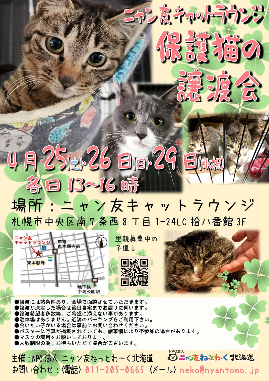 HOME猫を助ける名前もないまま亡くなる猫をなくすために‥寄付をして助けるニャン友のサポーターになる。継続的にニャン友の活動を応援したい方へ募金はこちらから 猫を助ける名前もないまま亡くなる猫をなくすために‥寄付をして助けるニャン友のサポーターになる。継続的にニャン友の活動を応援したい方へ募金はこちらから 保護猫をお迎えしたいあなたへ 保護猫をお迎えしたいあなたへ 猫を助ける 猫を助ける 関連リンク 関連リンク Youtube Youtube 保険情報 保険情報 アニコム損害保険株式会社 お申し込みはこちら SBIプリズム少額短期保険株式会社 お申し込みはこちら SNS情報 SNS情報Instagram nyantomo_network ★DMは解放しておりません。お問い合 ★DMは解放しておりません。お問い合 ★DMは解放しておりません。お問い合 ★DMは解放しておりません。お問い合 さらに読み込む... Instagram でフォロー nyantomo_network ★DMは解放しておりません。お問い合 ★DMは解放しておりません。お問い合 ★DMは解放しておりません。お問い合 ★DMは解放しておりません。お問い合 さらに読み込む... Instagram でフォロー Facebook Twitter 里親募集 里親募集募集状況里親募集中里親募集中名前エル くるみ 年齢約2歳 性別メス 詳細を見る 里親募集中里親募集中名前星組 ソート 年齢約7ヵ月 性別オス 詳細を見る 里親募集中里親募集中名前函館サカエマチ 寿子 年齢約2歳6ヵ月 性別メス 詳細を見る 里親募集中里親募集中名前函館サカエマチ 竹子 年齢約2歳6ヵ月 性別メス 詳細を見る 里親募集中里親募集中名前豊浦 ジェニー 年齢約2歳 性別メス 詳細を見る 里親募集中里親募集中名前奥尻 もとき 年齢約6ヵ月 性別オス 詳細を見る 里親募集中里親募集中名前奥尻 ひろと 年齢約6ヵ月 性別オス 詳細を見る 里親募集中里親募集中名前星組 パフィ 年齢約7ヵ月 性別メス 詳細を見る 里親募集中里親募集中名前星組 ギン 年齢約7ヵ月 性別オス 詳細を見る 里親募集中里親募集中名前星組 ナダル 年齢約7ヵ月 性別オス 詳細を見る 里親募集中里親募集中名前北見 黒たん 年齢約11ヵ月 性別オス 詳細を見る 里親募集中里親募集中名前北見 麦 年齢約10ヵ月 性別メス 詳細を見る 里親募集中里親募集中名前北見 むぎっち 年齢約10ヵ月 性別メス 詳細を見る 里親募集中里親募集中名前北見 ミケ 年齢約10ヵ月 性別メス 詳細を見る 里親募集中里親募集中名前北見 まがり 年齢約10ヵ月 性別オス 詳細を見る ニャン友Blog ニャン友blog NEW! 【04/25、26、29】ニャン友キャットラウンジ保護猫の譲渡会[札幌市][ニャン友ねっとわーく北海道] 2026/04/16 15:59 GW直前(人によりますが)譲渡会! 「連休のうちにお迎えして早く家や人に慣れてもらいたい」 そんな方にはぴったりの時期です。 もちろ… チカホ チャリティバザー始まってます![ニャン友ねっとわーく北海道] 2026/04/02 12:59 チカホ チャリティバザー始まってます! 憩いの空間 北1条東(②、③、④、⑤)で皆様のお越しをお待ちしています。 … 【04/05】ニャン友キャットラウンジ保護猫の譲渡会[札幌市][ニャン友ねっとわーく北海道] 2026/04/01 08:30 4月です。 新しい環境になる方も多い季節。 猫可物件に引っ越す方が増えると期待しつつ、譲渡会開催です。 先週奥尻にTNR事業の手伝いに… 【04/11-12】保護猫の譲渡会 ジョイフルエーケー 大麻店[江別市][ニャン友ねっとわーく北海道] 2026/03/28 12:53 あれよあれよと、3月も後半となりました。 北海道にも春の便りが来始めていますね。 4月もジョイフルエーケー大麻店(江別市大麻198−3)さ… 【04/02-04】保護猫、保護犬のためのチャリティバザー in チカホ[札幌市][ニャン友ねっとわーく北海道] 2026/03/21 16:46 今年も、昨年のように春が速足で近づいてきていますね。 雪も解けて、お外を歩くのも楽しい季節がやって参りました。 ですが、来る4月2… 【04/18-19】保護猫の譲渡会in苫小牧市[苫小牧市][ニャン友ねっとわーく北海道] 2026/03/20 23:49 春の便りが各地から届く季節となりました。 季節の移ろいと共に新生活が始まる方、希望に満ち溢れ幸せの花が咲く様にと願わずにはいられません。 … 【奥尻TNR事業】奥尻島にきています[ニャン友ねっとわーく北海道] 2026/03/20 00:44 昨年春に相談のあった奥尻島の100以上の未去勢未避妊の猫たちの避妊去勢手術の依頼ですが、昨年5月初旬に島に入ると島全体で猫が20匹しか見当た… 【04/02-04】保護猫、保護犬のためのチャリティバザー in チカホ[札幌市][ニャン友ねっとわーく北海道] 2026/03/17 12:40 今年も、昨年のように春が速足で近づいてきていますね。 雪も解けて、お外を歩くのも楽しい季節がやって参りました。 ですが、来る4月2日(… 【03/29】保護猫の譲渡会in伊達[伊達市][ニャン友ねっとわーく北海道] 2026/03/13 19:23 皆さま、こんにちは。 先日の三ッ和会館の譲渡会では、天候が悪い中、足を運んで下さって、ありがとうございます。 沢山の御寄付、支援物資も頂… 【03/28】みなみ北海道動保護犬・保護猫合同譲渡会 vol.8[函館市][ニャン友ねっとわーく北海道] 20