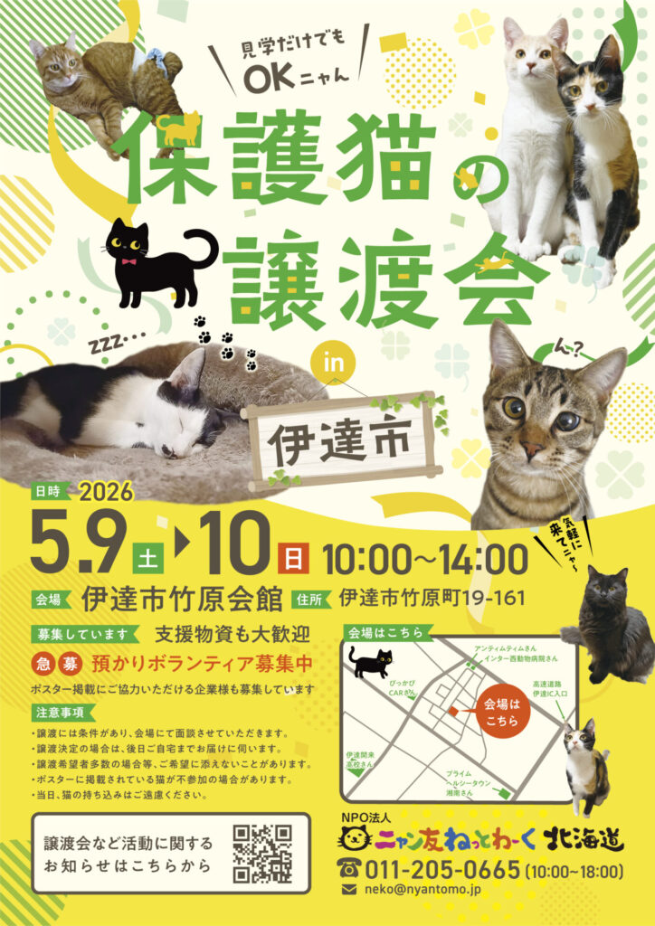 HOME猫を助ける名前もないまま亡くなる猫をなくすために‥寄付をして助けるニャン友のサポーターになる。継続的にニャン友の活動を応援したい方へ募金はこちらから 猫を助ける名前もないまま亡くなる猫をなくすために‥寄付をして助けるニャン友のサポーターになる。継続的にニャン友の活動を応援したい方へ募金はこちらから 保護猫をお迎えしたいあなたへ 保護猫をお迎えしたいあなたへ 猫を助ける 猫を助ける 関連リンク 関連リンク Youtube Youtube 保険情報 保険情報 アニコム損害保険株式会社 お申し込みはこちら SBIプリズム少額短期保険株式会社 お申し込みはこちら SNS情報 SNS情報Instagram nyantomo_network 現在ラウンジにいる 黒白っコ達 【ち ★DMは解放しておりません。お問い合 ★DMは解放しておりません。お問い合 ★DMは解放しておりません。お問い合 さらに読み込む... Instagram でフォロー nyantomo_network 現在ラウンジにいる 黒白っコ達 【ち ★DMは解放しておりません。お問い合 ★DMは解放しておりません。お問い合 ★DMは解放しておりません。お問い合 さらに読み込む... Instagram でフォロー Facebook Twitter 里親募集 里親募集募集状況里親募集中里親募集中名前積丹 キキ 年齢約2歳3ヵ月 性別メス 詳細を見る 里親募集中里親募集中名前積丹 くおん 年齢約2歳3ヵ月 性別メス 詳細を見る 里親募集中里親募集中名前北黄金 俊介 年齢約4歳 性別オス 詳細を見る 里親募集中里親募集中名前エル くるみ 年齢約2歳 性別メス 詳細を見る 里親募集中里親募集中名前星組 ソート 年齢約7ヵ月 性別オス 詳細を見る 里親募集中里親募集中名前函館サカエマチ 寿子 年齢約2歳6ヵ月 性別メス 詳細を見る 里親募集中里親募集中名前函館サカエマチ 竹子 年齢約2歳6ヵ月 性別メス 詳細を見る 里親募集中里親募集中名前豊浦 ジェニー 年齢約2歳 性別メス 詳細を見る 里親募集中里親募集中名前奥尻 もとき 年齢約6ヵ月 性別オス 詳細を見る 里親募集中里親募集中名前奥尻 ひろと 年齢約6ヵ月 性別オス 詳細を見る 里親募集中里親募集中名前星組 パフィ 年齢約7ヵ月 性別メス 詳細を見る 里親募集中里親募集中名前星組 ギン 年齢約7ヵ月 性別オス 詳細を見る 里親募集中里親募集中名前星組 ナダル 年齢約7ヵ月 性別オス 詳細を見る 里親募集中里親募集中名前北見 黒たん 年齢約11ヵ月 性別オス 詳細を見る 里親募集中里親募集中名前北見 麦 年齢約10ヵ月 性別メス 詳細を見る ニャン友Blog ニャン友blog ご支援のお礼[ニャン友ねっとわーく北海道] 2026/04/18 21:39 いつもニャン友ねっとわーく北海道の活動にご理解・ご協力・ご支援いただきましてありがとうございます。 4月17日までにいただいたご支援… 【04/25、26、29】ニャン友キャットラウンジ保護猫の譲渡会[札幌市][ニャン友ねっとわーく北海道] 2026/04/16 15:59 GW直前(人によりますが)譲渡会! 「連休のうちにお迎えして早く家や人に慣れてもらいたい」 そんな方にはぴったりの時期です。 もちろ… チカホ チャリティバザー始まってます![ニャン友ねっとわーく北海道] 2026/04/02 12:59 チカホ チャリティバザー始まってます! 憩いの空間 北1条東(②、③、④、⑤)で皆様のお越しをお待ちしています。 … 【04/05】ニャン友キャットラウンジ保護猫の譲渡会[札幌市][ニャン友ねっとわーく北海道] 2026/04/01 08:30 4月です。 新しい環境になる方も多い季節。 猫可物件に引っ越す方が増えると期待しつつ、譲渡会開催です。 先週奥尻にTNR事業の手伝いに… 【04/11-12】保護猫の譲渡会 ジョイフルエーケー 大麻店[江別市][ニャン友ねっとわーく北海道] 2026/03/28 12:53 あれよあれよと、3月も後半となりました。 北海道にも春の便りが来始めていますね。 4月もジョイフルエーケー大麻店(江別市大麻198−3)さ… 【04/02-04】保護猫、保護犬のためのチャリティバザー in チカホ[札幌市][ニャン友ねっとわーく北海道] 2026/03/21 16:46 今年も、昨年のように春が速足で近づいてきていますね。 雪も解けて、お外を歩くのも楽しい季節がやって参りました。 ですが、来る4月2… 【04/18-19】保護猫の譲渡会in苫小牧市[苫小牧市][ニャン友ねっとわーく北海道] 2026/03/20 23:49 春の便りが各地から届く季節となりました。 季節の移ろいと共に新生活が始まる方、希望に満ち溢れ幸せの花が咲く様にと願わずにはいられません。 … 【奥尻TNR事業】奥尻島にきています[ニャン友ねっとわーく北海道] 2026/03/20 00:44 昨年春に相談のあった奥尻島の100以上の未去勢未避妊の猫たちの避妊去勢手術の依頼ですが、昨年5月初旬に島に入ると島全体で猫が20匹しか見当た… 【04/02-04】保護猫、保護犬のためのチャリティバザー in チカホ[札幌市][ニャン友ねっとわーく北海道] 2026/03/17 12:40 今年も、昨年のように春が速足で近づいてきていますね。 雪も解けて、お外を歩くのも楽しい季節がやって参りました。 ですが、来る4月2日(… 【03/29】保護猫の譲渡会in伊達[伊達市][ニャン友ねっとわーく北海道] 2026/03/13 19:23 皆さま、こんにちは。 先日の三ッ和会館の譲渡会