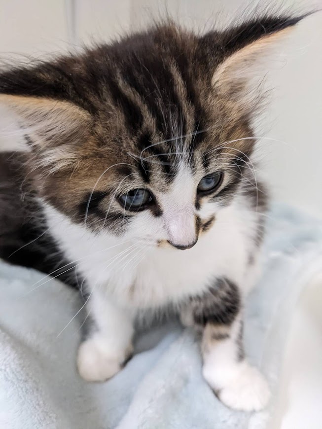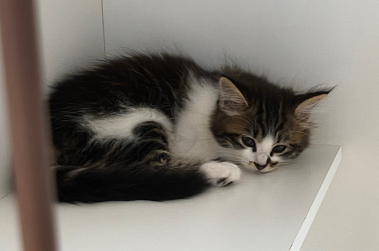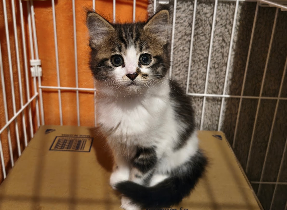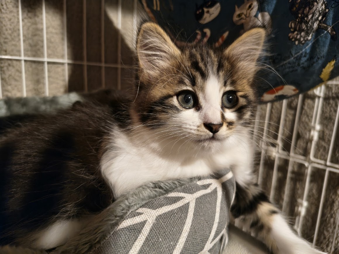 ふわっとしたキジシロで背中は黒いです。