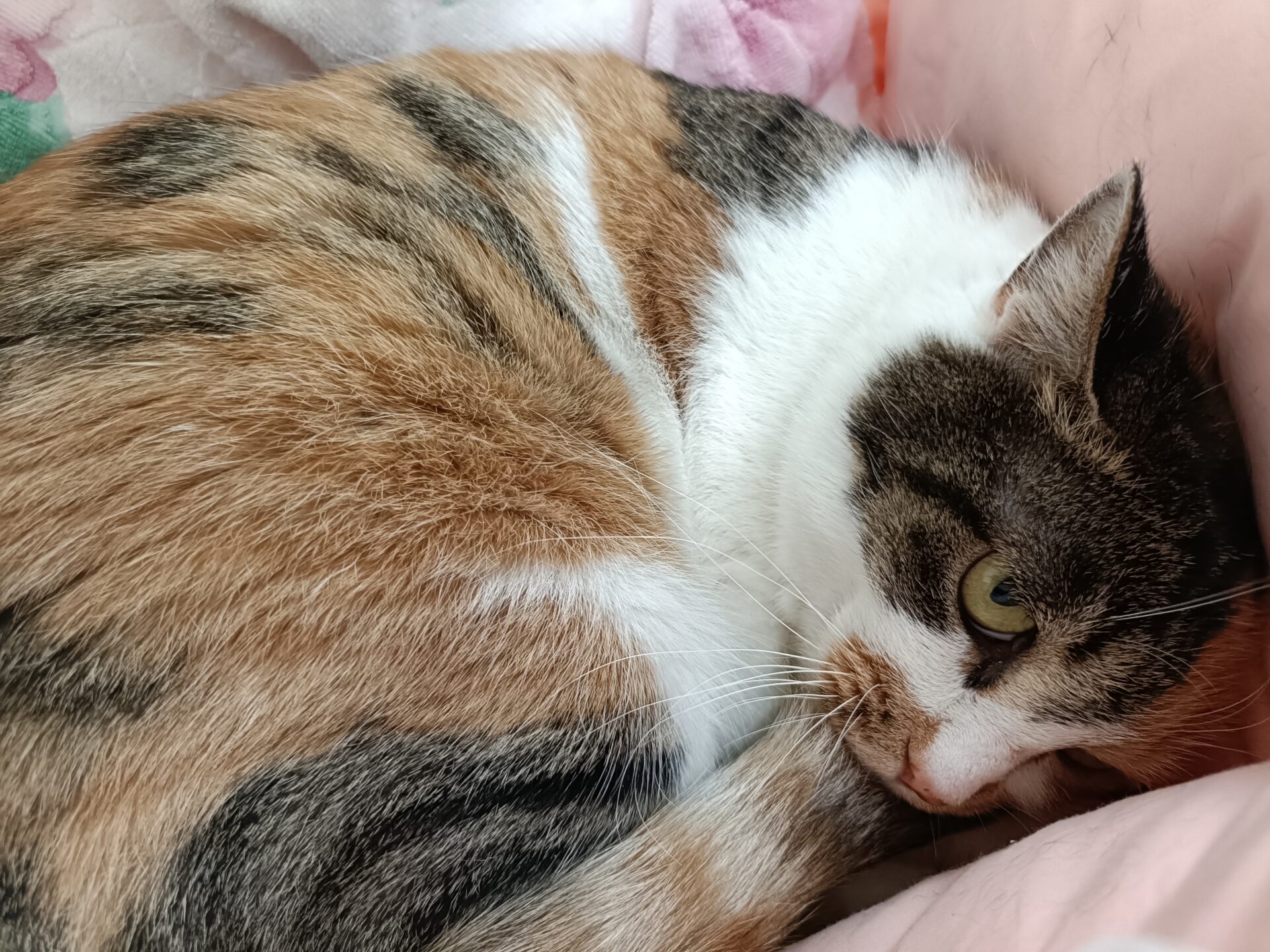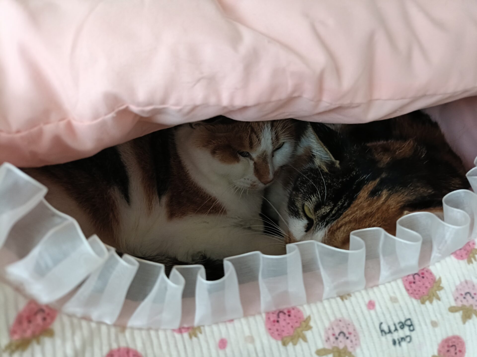 ベッドにもタオルにも潜るの大好きな人見知り発動中のミケちゃんですが、隠れながらもタオルの下ではきちんとご飯も食べている謎キャラ。