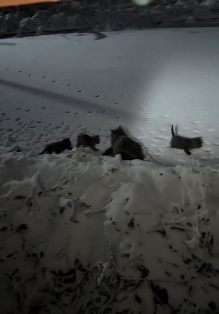雪の降る中、ママ猫と一緒に外をうろうろしていました。